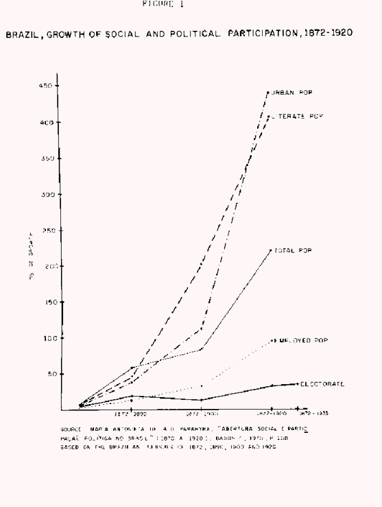 The establishment of the Republic is the gesture of a class, the demand of an ascending group... The First Republic is a period in which the coffee lords rise to power, reach their climax, and later decline... The government is the representation of only one [class]; the others live in a marginalization process.(9)Carone is well aware of the difficulties of linking a straightforward class interpretation to well known facts, such as the presence of the military and the monarchists in the political life of the time. His answer tends to be historiographic and casuistic. He says, for instance, that the military "despises civilians" (Part XIII), that they were divided between those who wanted to respect the constitutional rules of civilian power and those who aimed to "co-participate" in power; he finishes by considering the military a segment of the "middle classes." (Part XVI).